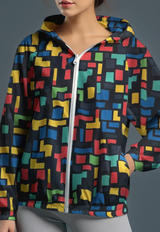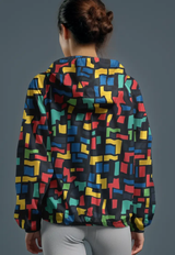LSC95 jaket lari wanita parasut motif "tetris colorful" hitam multicolor