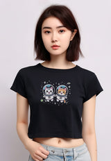 LTF85 Kaos Crop Top Wanita Gambar "kucing anjing astronot" hitam