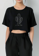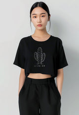 LTH06 Kaos Crop Top Wanita "cactus outline" OLC hitam