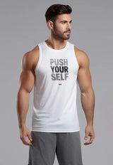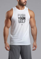 MSA54 kaos fitnes pria 4way stretch nanoamid anti bau "push yourself " putih